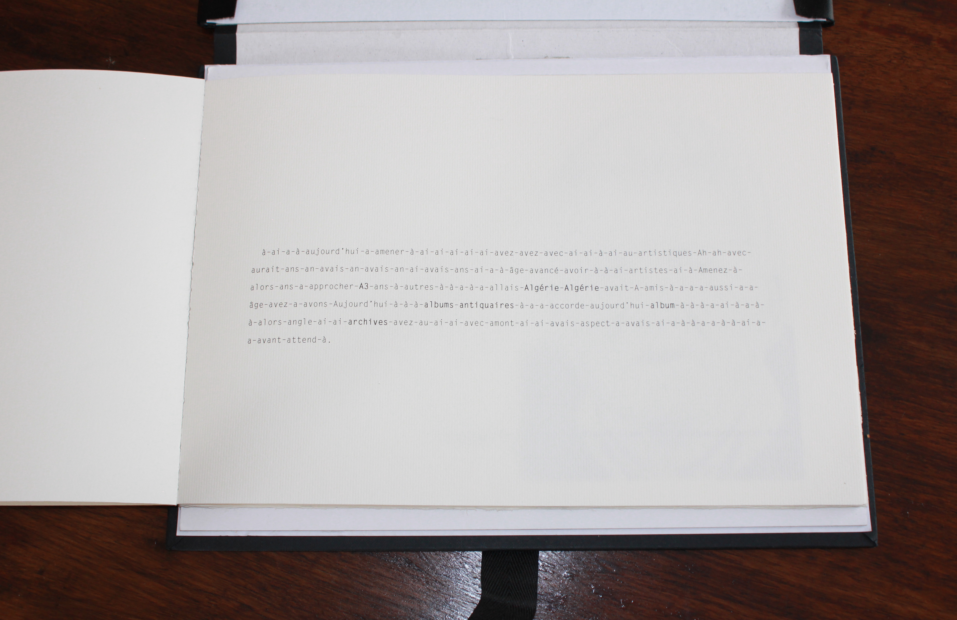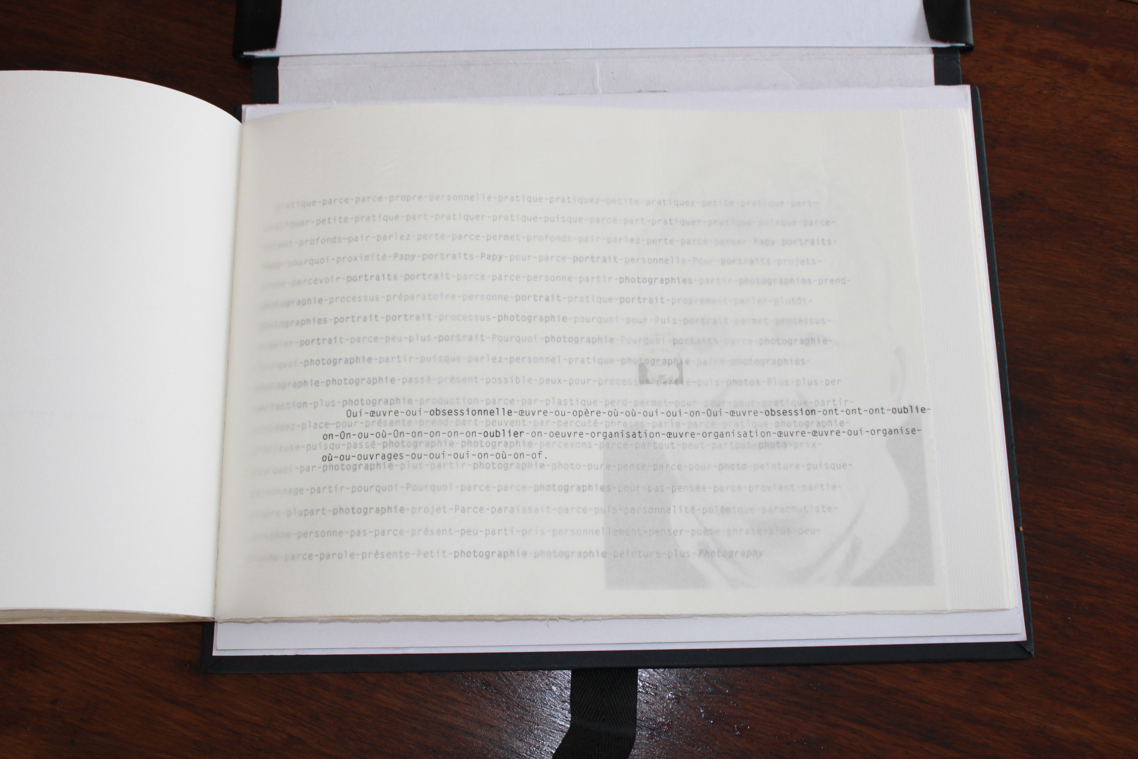 Cet entretien a été restitué sous forme de livre où les mots ont été classés à la manière d’un répertoire alphabétique. Chaque mot répertorié est recensé uniquement par sa première lettre et est classé dans la chronologie de l’entretien. Le classement laisse apparaître par la répétition la prédominance des mots les plus caractéristiques de sa recherche.